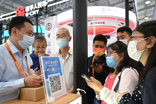 在2021年中國國際服務(wù)貿(mào)易交易會(huì)金融服務(wù)專題展區(qū),觀眾在咨詢數(shù)字人民幣支付業(yè)務(wù)。