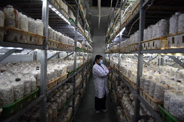 河南世紀(jì)香食用菌開(kāi)發(fā)有限公司員工正在查看白靈菇菌種生長(zhǎng)情況。新華社記者 李嘉南 攝
