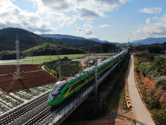 1月3日,列車行駛在位于云南西雙版納傣族自治州景洪市境內(nèi)的中老鐵路上(無人機照片)。