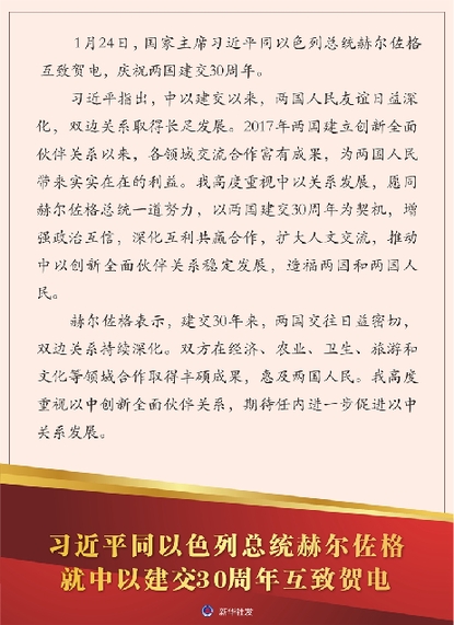 新華社北京1月24日電 1月24日,國(guó)家主席習(xí)近平同以色列總統(tǒng)赫爾佐格互致賀電,慶祝兩國(guó)建交30周年。