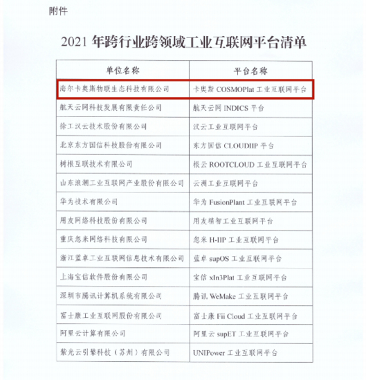 近日,工信部公布了2021年跨行業(yè)跨領域工業(yè)互聯(lián)網(wǎng)平臺清單,卡奧斯COSMOPlat工業(yè)互聯(lián)網(wǎng)平臺、航天云網(wǎng)INDICS平臺、漢云工業(yè)互聯(lián)網(wǎng)平臺等15家平臺入選,其中,卡奧斯COSMOPlat位居首位。
