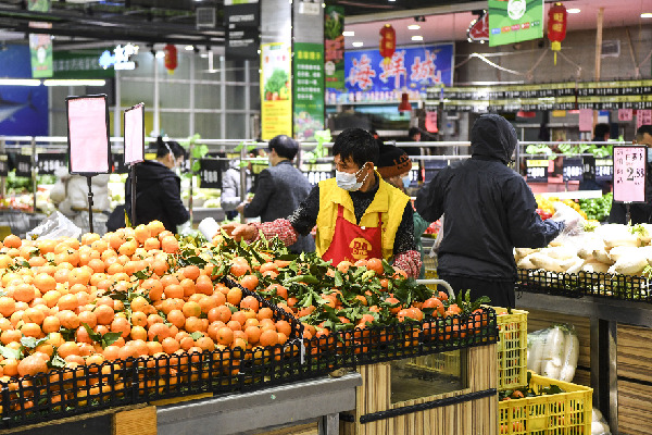 2月9日,工作人員在廣西德??h一家超市內(nèi)補充投放新鮮水果。