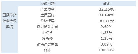報(bào)告顯示,直播帶貨消費(fèi)維權(quán)輿情反映的主要問(wèn)題中,涉及產(chǎn)品質(zhì)量問(wèn)題的占32.35%,虛假宣傳的占31.64%,價(jià)格誤導(dǎo)的占30.21%,誘導(dǎo)場(chǎng)外交易的占2.69%,退換貨的占1.83%,發(fā)貨慢的占1.20%,銷(xiāo)售違禁商品的占0.09%。其中,產(chǎn)品質(zhì)量、虛假宣傳、價(jià)格誤導(dǎo)等直播帶貨問(wèn)題最為突出。