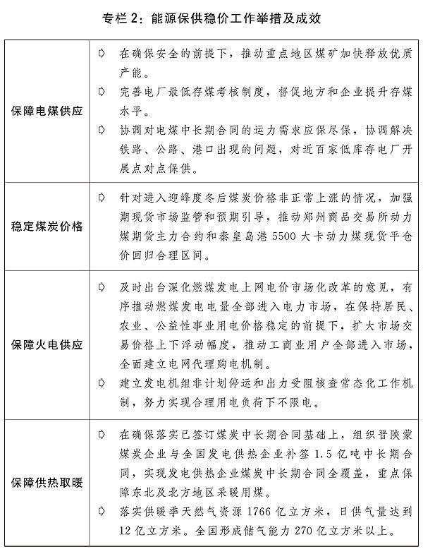 同時(shí),統(tǒng)籌高效做好煤電油氣運(yùn)調(diào)節(jié)。充分發(fā)揮煤電油氣運(yùn)保障工作部際協(xié)調(diào)機(jī)制作用,壓實(shí)地方政府、部門(mén)、企業(yè)責(zé)任,堅(jiān)持先立后破、民生優(yōu)先,確保能源安全供應(yīng)。增強(qiáng)國(guó)內(nèi)資源生產(chǎn)保障能力,加快油氣、礦產(chǎn)等資源勘探開(kāi)發(fā),鞏固發(fā)展增儲(chǔ)上產(chǎn)良好勢(shì)頭。保障電煤供應(yīng),加大重點(diǎn)產(chǎn)煤地區(qū)和運(yùn)力緊張地區(qū)的電煤運(yùn)輸保障,完善煤炭市場(chǎng)價(jià)格形成機(jī)制,提升電力保障能力,確保穩(wěn)定可靠充足供應(yīng),完善新能源上網(wǎng)電價(jià)機(jī)制,提高天然氣氣源保障水平。有序推進(jìn)能源結(jié)構(gòu)調(diào)整優(yōu)化。實(shí)施全面節(jié)約戰(zhàn)略,加強(qiáng)精細(xì)化用能管理,確保民生和公共用能需求,推動(dòng)能效低于基準(zhǔn)水平的重點(diǎn)行業(yè)企業(yè)有序?qū)嵤└脑焐?jí),推動(dòng)全社會(huì)加強(qiáng)節(jié)約用電用能。完善國(guó)家戰(zhàn)略物資儲(chǔ)備制度。