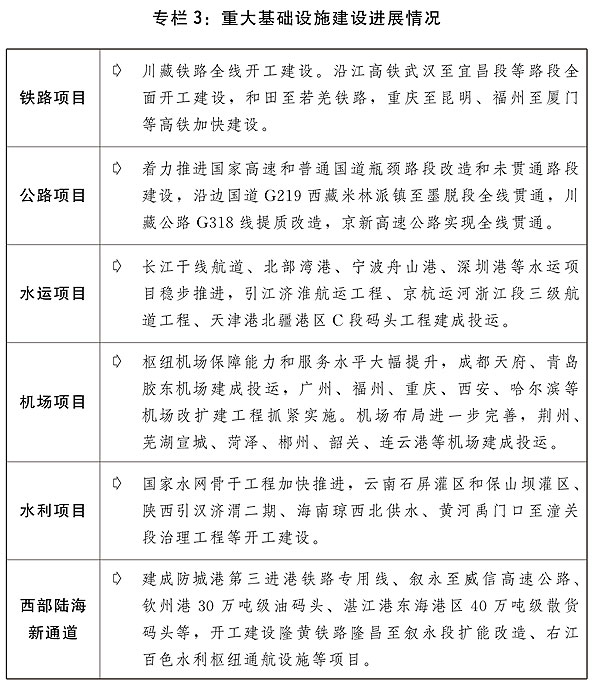 四是適度超前開(kāi)展重大基礎(chǔ)設(shè)施建設(shè)。精準(zhǔn)有效推進(jìn)交通、水利、物流、能源、新型基礎(chǔ)設(shè)施、民生等領(lǐng)域重大基礎(chǔ)設(shè)施項(xiàng)目建設(shè)。推進(jìn)川藏鐵路、西部陸海新通道、沿江高鐵、一批鐵路專用線重點(diǎn)項(xiàng)目和川藏公路G318線提質(zhì)改造等加快建設(shè)。整體推進(jìn)京津冀、長(zhǎng)三角、粵港澳大灣區(qū)城市群城際鐵路、市域(郊)鐵路建設(shè)。鼓勵(lì)推廣軌道交通+土地綜合開(kāi)發(fā)模式經(jīng)驗(yàn)。做好中長(zhǎng)期鐵路網(wǎng)、國(guó)家公路網(wǎng)和全國(guó)港口與航道布局規(guī)劃修編,強(qiáng)化國(guó)家公路、港口和高等級(jí)航道網(wǎng)絡(luò)功能。推動(dòng)三峽水運(yùn)新通道研究論證。實(shí)施國(guó)家水網(wǎng)重大工程。加快發(fā)展公鐵水多式聯(lián)運(yùn)。提升樞紐機(jī)場(chǎng)綜合保障能力和服務(wù)水平,加快培育支線航空市場(chǎng),提高國(guó)際航空貨運(yùn)能力。加快“支點(diǎn)城市+骨干走廊”現(xiàn)代流通網(wǎng)絡(luò)建設(shè)。穩(wěn)步推進(jìn)國(guó)家物流樞紐、國(guó)家骨干冷鏈物流基地建設(shè),強(qiáng)化冷鏈運(yùn)輸環(huán)節(jié)疫情防控措施,完善“321”冷鏈物流運(yùn)行體系。加快物流業(yè)制造業(yè)融合創(chuàng)新發(fā)展,積極推動(dòng)多式聯(lián)運(yùn)、智慧物流等新業(yè)態(tài)新模式發(fā)展。布局一批新型基礎(chǔ)設(shè)施項(xiàng)目,加快推進(jìn)5G、千兆光網(wǎng)、一體化大數(shù)據(jù)中心、北斗產(chǎn)業(yè)化重大工程、民用空間基礎(chǔ)設(shè)施等建設(shè),推動(dòng)傳統(tǒng)基礎(chǔ)設(shè)施智能化改造。