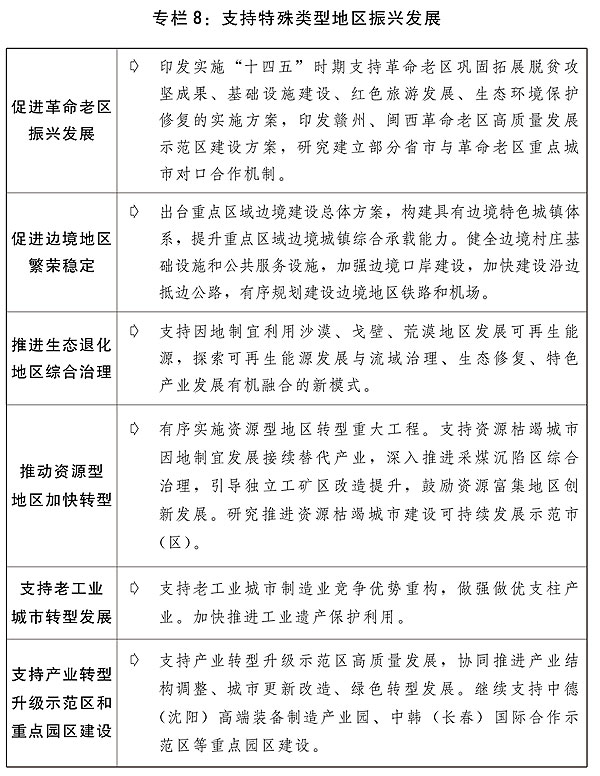 二是提高區(qū)域協(xié)調(diào)發(fā)展水平。推動(dòng)西部大開(kāi)發(fā)形成新格局,發(fā)揮風(fēng)、光、水電和礦產(chǎn)資源優(yōu)勢(shì)建設(shè)大型清潔能源基地。積極發(fā)展文化和旅游產(chǎn)業(yè)。實(shí)施重要生態(tài)系統(tǒng)保護(hù)和修復(fù)工程,加快重大項(xiàng)目規(guī)劃建設(shè)。推進(jìn)貴州大數(shù)據(jù)綜合試驗(yàn)區(qū)建設(shè)。積極穩(wěn)妥推進(jìn)雅魯藏布江下游水電開(kāi)發(fā)等重大工程。推動(dòng)?xùn)|北振興取得新突破,組織實(shí)施好東北全面振興“十四五”實(shí)施方案,繼續(xù)推進(jìn)黑瞎子島中俄國(guó)際合作示范區(qū)建設(shè),積極推動(dòng)大小興安嶺林區(qū)生態(tài)保護(hù)與經(jīng)濟(jì)轉(zhuǎn)型,穩(wěn)步推進(jìn)長(zhǎng)吉圖開(kāi)發(fā)開(kāi)放先導(dǎo)區(qū)發(fā)展,推動(dòng)《東北振興重點(diǎn)項(xiàng)目三年滾動(dòng)實(shí)施方案》重點(diǎn)項(xiàng)目加快建設(shè)。推動(dòng)中部地區(qū)高質(zhì)量發(fā)展,推動(dòng)湘鄂贛協(xié)同高質(zhì)量發(fā)展,支持晉陜?cè)S河金三角承接產(chǎn)業(yè)轉(zhuǎn)移示范區(qū)建設(shè),支持山西進(jìn)一步深化能源革命綜合改革試點(diǎn),推進(jìn)淮海合作區(qū)協(xié)同發(fā)展,支持中國(guó)(武漢)光谷建設(shè),編制出臺(tái)洞庭湖生態(tài)經(jīng)濟(jì)區(qū)規(guī)劃。鼓勵(lì)東部加快高質(zhì)量發(fā)展,支持福建高質(zhì)量發(fā)展及平潭綜合實(shí)驗(yàn)區(qū)建設(shè),推動(dòng)山東新舊動(dòng)能轉(zhuǎn)換綜合試驗(yàn)區(qū)建設(shè)取得新進(jìn)展。支持民族地區(qū)改善生產(chǎn)生活條件,加強(qiáng)各民族交流交往交融,鑄牢中華民族共同體意識(shí)。推動(dòng)革命老區(qū)、邊境地區(qū)、生態(tài)退化地區(qū)、資源型地區(qū)、老工業(yè)城市等特殊類型地區(qū)振興發(fā)展,推進(jìn)國(guó)家級(jí)新區(qū)、臨空經(jīng)濟(jì)示范區(qū)、承接產(chǎn)業(yè)轉(zhuǎn)移示范區(qū)等功能平臺(tái)建設(shè),推動(dòng)國(guó)家自主創(chuàng)新示范區(qū)和高新區(qū)高質(zhì)量發(fā)展。支持海洋經(jīng)濟(jì)發(fā)展示范區(qū)、現(xiàn)代海洋城市等建設(shè),提升海洋資源開(kāi)發(fā)利用水平。