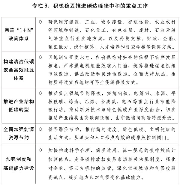 二是積極穩(wěn)妥推進(jìn)碳達(dá)峰碳中和。完善碳達(dá)峰碳中和“1+N”政策體系,實(shí)施“碳達(dá)峰十大行動(dòng)”,堅(jiān)持“全國(guó)一盤(pán)棋”。大力發(fā)展非化石能源,建設(shè)大型風(fēng)電、光伏基地項(xiàng)目,積極發(fā)展分布式新能源,積極推動(dòng)海上風(fēng)電集群化開(kāi)發(fā),穩(wěn)妥推進(jìn)西南等地大型水電基地建設(shè),大力發(fā)展抽水蓄能,在確保絕對(duì)安全的前提下積極有序發(fā)展核電,推進(jìn)煤炭清潔高效利用。提升電網(wǎng)對(duì)可再生能源發(fā)電的消納能力。做好全國(guó)碳排放權(quán)交易市場(chǎng)第二個(gè)履約周期管理。實(shí)施節(jié)能降碳改造升級(jí)。積極研究開(kāi)發(fā)碳捕捉利用與封存技術(shù)。優(yōu)化完善能耗雙控政策,合理增加能耗總量彈性,新增可再生能源和原料用能不納入能源消費(fèi)總量控制,推動(dòng)能耗“雙控”向碳排放總量和強(qiáng)度“雙控”轉(zhuǎn)變。全面加強(qiáng)能源資源節(jié)約,強(qiáng)化工業(yè)、交通和建筑節(jié)能,不斷降低單位產(chǎn)出能耗物耗和碳排放。對(duì)標(biāo)能效標(biāo)桿水平,推動(dòng)能效低于基準(zhǔn)水平的重點(diǎn)行業(yè)企業(yè),有序?qū)嵤└脑焐?jí),促進(jìn)高耗能行業(yè)高質(zhì)量發(fā)展。繼續(xù)做好碳達(dá)峰碳中和及應(yīng)對(duì)氣候變化國(guó)際談判與合作,主動(dòng)參與全球綠色治理體系建設(shè),加強(qiáng)綠色經(jīng)貿(mào)、技術(shù)與金融合作。