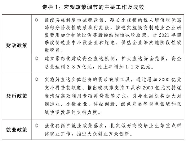 ?。ǘ﹦?chuàng)新和完善宏觀調(diào)控,經(jīng)濟(jì)基本盤(pán)進(jìn)一步鞏固。加快構(gòu)建新發(fā)展格局,加強(qiáng)宏觀政策跨周期調(diào)節(jié),做好保供穩(wěn)價(jià)工作,加大助企紓困力度,實(shí)現(xiàn)了較高增長(zhǎng)和較低通脹的優(yōu)化組合,經(jīng)濟(jì)保持較好發(fā)展態(tài)勢(shì)。