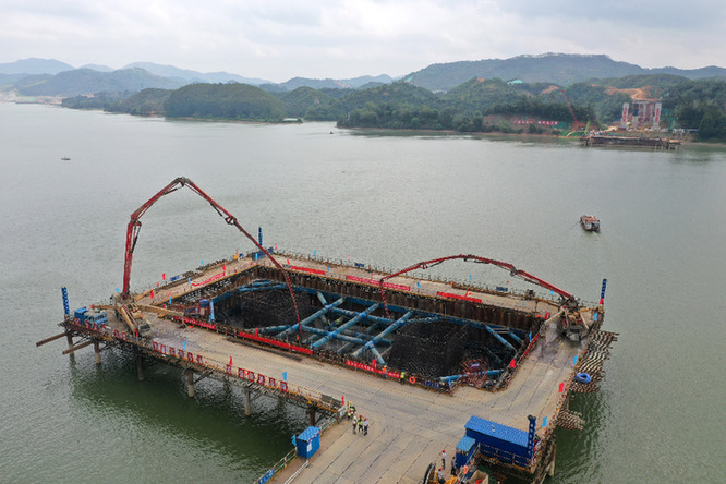 3月21日,在廣西上林至橫州高速公路西津郁江特大橋建設(shè)現(xiàn)場,中鐵四局工人在進行水中承臺的澆筑施工作業(yè)(無人機照片)。