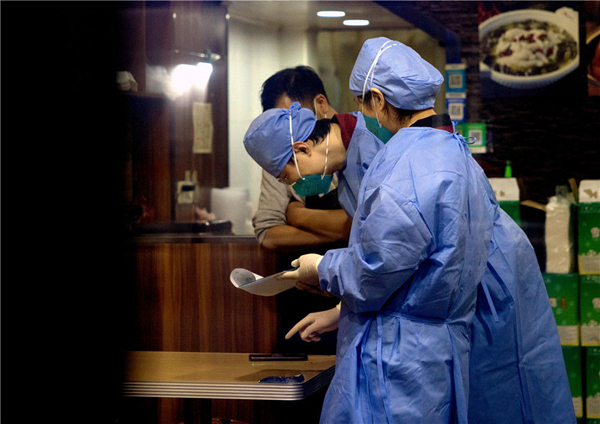 3月17日凌晨,上海市青浦區(qū)疾控中心流調(diào)人員在相關(guān)場(chǎng)所進(jìn)行排摸。新華社記者 劉穎 攝