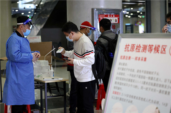 3月27日,在合肥火車(chē)站出站大廳,出站旅客領(lǐng)取免費(fèi)發(fā)放的抗原檢測(cè)試劑。新華社發(fā)(解琛 攝)