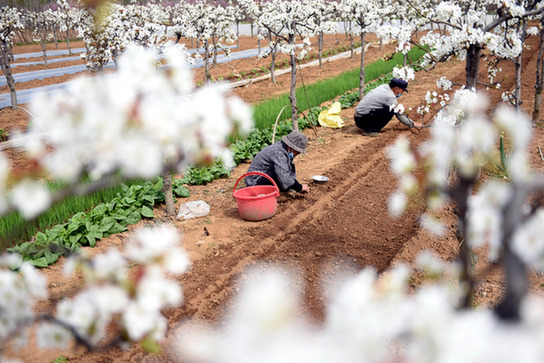 4月5日,山東省臨沂市郯城縣馬頭鎮(zhèn)桑莊村果農(nóng)在梨園里勞作。