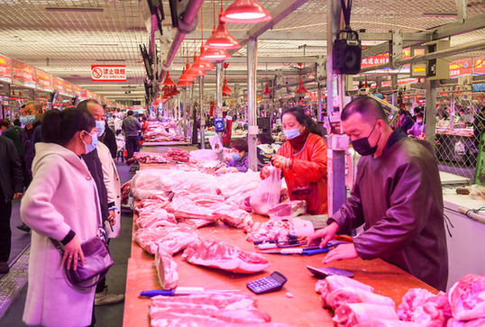 在農(nóng)貿(mào)批發(fā)市場,市民在采購豬肉。(資料照片)新華社記者 彭源 攝