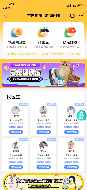 目前,京東健康寵物醫(yī)院提供包括犬、貓、全科等七個(gè)科室的7×24免費(fèi)在線健康咨詢服務(wù),截至2021年底,已有超過(guò)5000位寵物醫(yī)生在線服務(wù),用戶能夠享受圖文咨詢和視頻咨詢兩種服務(wù)方式。寵物主只需要打開京東APP,搜索“寵物醫(yī)院”,執(zhí)業(yè)醫(yī)生就會(huì)提供防疫指導(dǎo)和急癥處理,包括寵物居家情緒疏導(dǎo)指引、寵物居家隔離慢病管理、寵物突發(fā)健康狀況在線急救等。