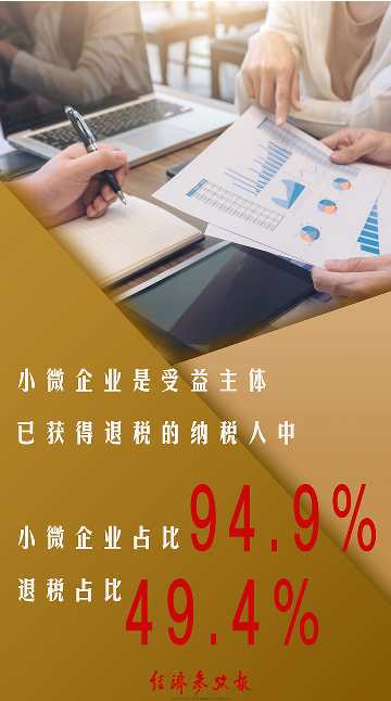 已獲得退稅的納稅人中,小微企業(yè)占比94.9%,共計退稅7039億元,占比49.4%;中型企業(yè)占比4.4%,共計退稅3412億元,占比23.9%。