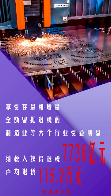 從行業(yè)看,享受存量和增量全額留抵退稅的制造業(yè)等六個行業(yè)受益明顯,納稅人獲得退稅7736億元,戶均退稅115.2萬元。