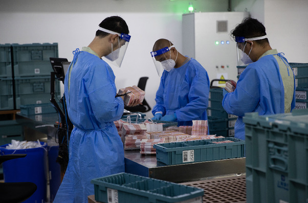 在上海銀行現(xiàn)金中心智能金庫,工作人員對現(xiàn)金進(jìn)行預(yù)處理,將現(xiàn)金放進(jìn)標(biāo)準(zhǔn)化容器,以便由帶有消毒模塊的大型清分機(jī)進(jìn)行自動清分作業(yè)。