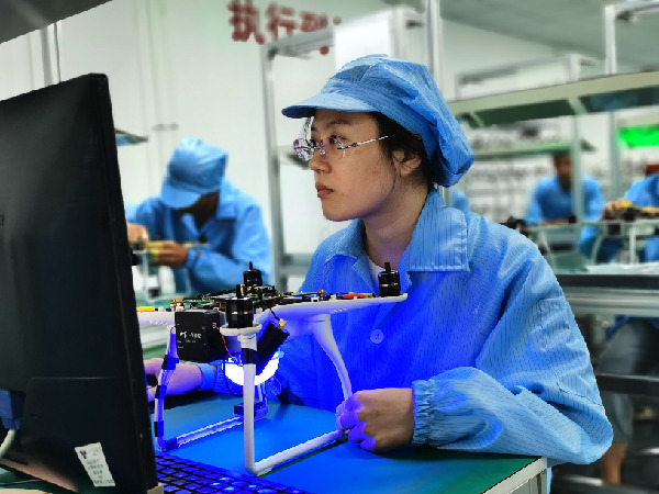 一飛智控(天津)科技有限公司工作人員正在組裝調(diào)試無人機。