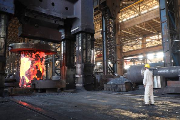水壓機鍛造廠車間內(nèi),一個10米多長、5米多寬的巨型鐵剪,正夾著一個燒得火紅透亮的合金鋼錠來到水壓機前,在咣咣的鍛壓聲中火星四射,很快就縮小了一大圈。