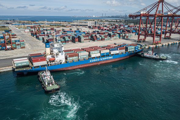 一艘中遠(yuǎn)海運(yùn)集裝箱貨輪在兩艘拖輪的輔助下,靠泊進(jìn)海南洋浦小鏟灘碼頭。記者 蒲曉旭 攝