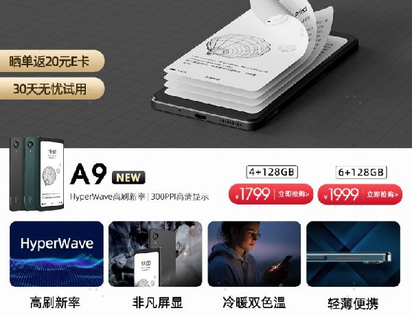 針對普通的墨水屏產(chǎn)品刷新速率較低的問題,海信閱讀手機A9還自主研發(fā)了HyperWave超波型顯示引擎,顯示對比度較上一代提升12%,屏幕刷新率最高提升33%,確保用戶獲得更接近紙質(zhì)書的閱讀體驗。