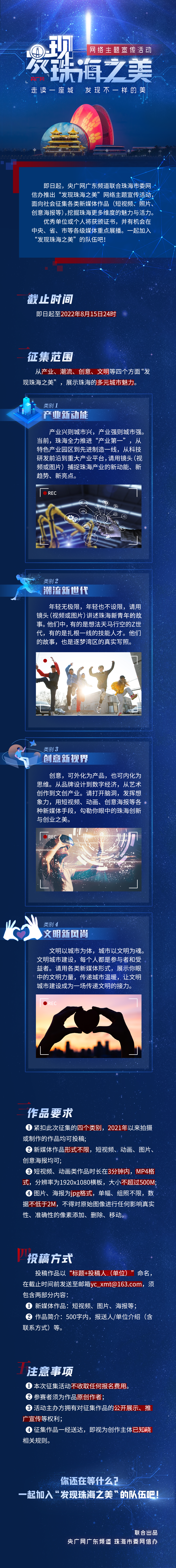 即日起,央廣網(wǎng)廣東頻道聯(lián)合珠海市委網(wǎng)信辦啟動(dòng)“發(fā)現(xiàn)珠海之美”網(wǎng)絡(luò)主題宣傳活動(dòng),面向社會(huì)征集產(chǎn)業(yè)科技、時(shí)尚潮流、創(chuàng)新創(chuàng)意、文明風(fēng)尚等四方面的新媒體作品,形式包括短視頻、圖片、海報(bào)等,優(yōu)秀作品將在中央、省、市等各級(jí)媒體重點(diǎn)展播。
