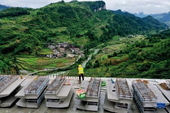 5月25日,貴南高鐵最高橋桐子園雙線特大橋的橋面系施工現(xiàn)場。圖/新華