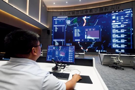 5月7日,在重慶市永川區(qū)智慧城市數(shù)字指揮大廳,工作人員利用生態(tài)環(huán)境智慧綜合監(jiān)管平臺進(jìn)行監(jiān)測、分析。圖/新華