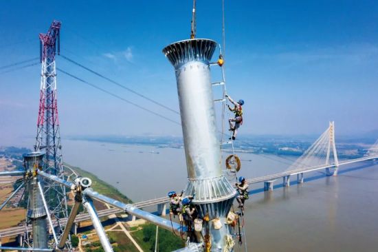 5月25日,安徽送變電工程有限公司施工人員在長江大跨越施工現(xiàn)場作業(yè)。圖/新華