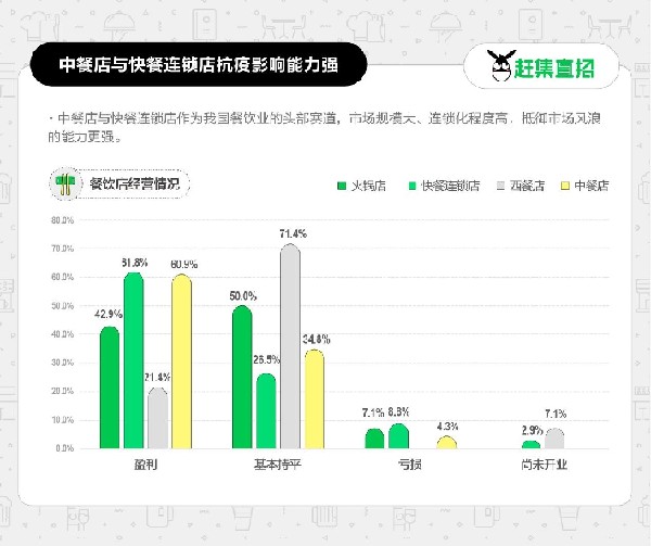調(diào)查數(shù)據(jù)顯示,中餐店與快餐連鎖店受疫情影響更小,受影響的店鋪比例分別為52.2%、44.1%?!翱觳瓦B鎖店經(jīng)營(yíng)方式更為靈活,像肯德基麥當(dāng)勞都很早之前就有在網(wǎng)上售賣優(yōu)惠券的銷售方式,每年618、雙十一這種大促還有很多消費(fèi)者會(huì)專門囤這個(gè)。當(dāng)然,在疫情期間,快餐連鎖店也都在積極尋找新的商機(jī),比如直播賣貨、社群活動(dòng)等?!壁s集直招核驗(yàn)團(tuán)隊(duì)負(fù)責(zé)人李浩分析道。