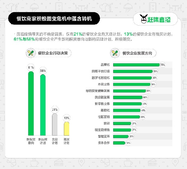 但即便面臨著疫情帶來的種種壓力,報(bào)告同時(shí)也揭示,僅有二成餐飲企業(yè)有撤店或閉店等計(jì)劃,13%的餐飲企業(yè)有裁員打算,61%與58%的餐飲企業(yè)產(chǎn)生新的投資意向與新的品牌計(jì)劃,可見更多的企業(yè)正在積極圖變。