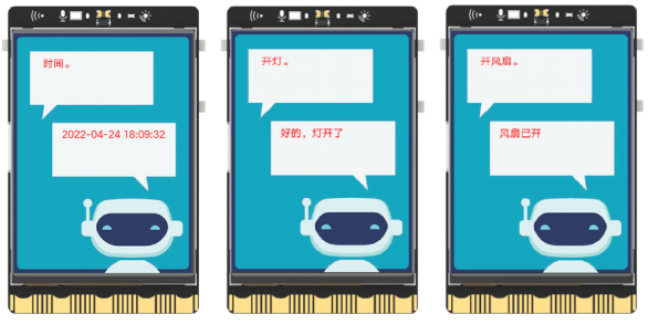 具體功能和操作如下,首先,將LED燈、風扇外接到行空版上,之后給行空板配置網(wǎng)絡,接著編寫并運行程序,在行空版屏幕上顯示背景圖和初始信息后,按下板載按鍵錄制語音,等待行空板依據(jù)程序自動將語音上傳至百度語音平臺并返回得到語音對應的文字內(nèi)容,隨后對文字內(nèi)容進行判別,當其中有“時間”兩個字時,自動檢測系統(tǒng)的時間并更新顯示在行空板的屏幕上,而當文字內(nèi)容中有“開燈”、“關燈”、“開風扇”、“關風扇”、“開鬧鐘”、“關鬧鐘”等信息時,行空板控制LED等、風扇、板載蜂鳴器執(zhí)行相應的操作。