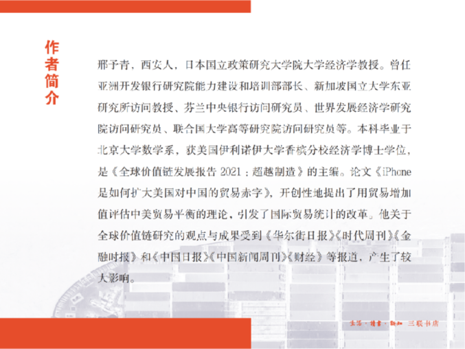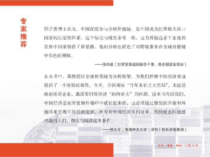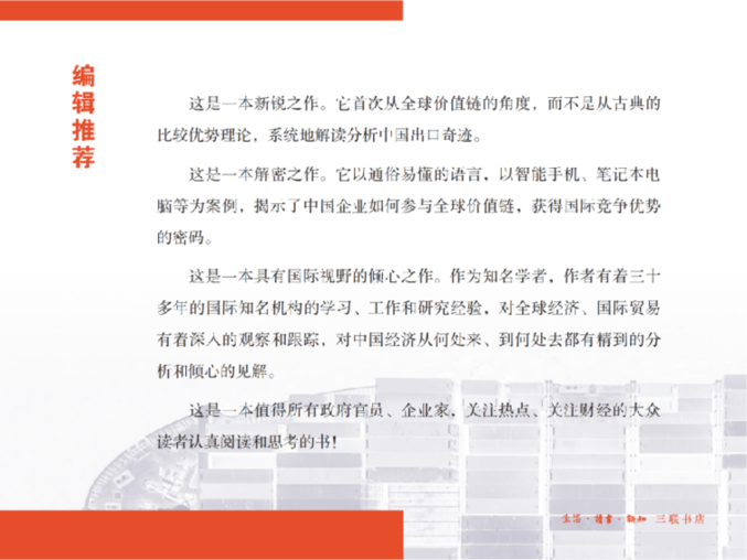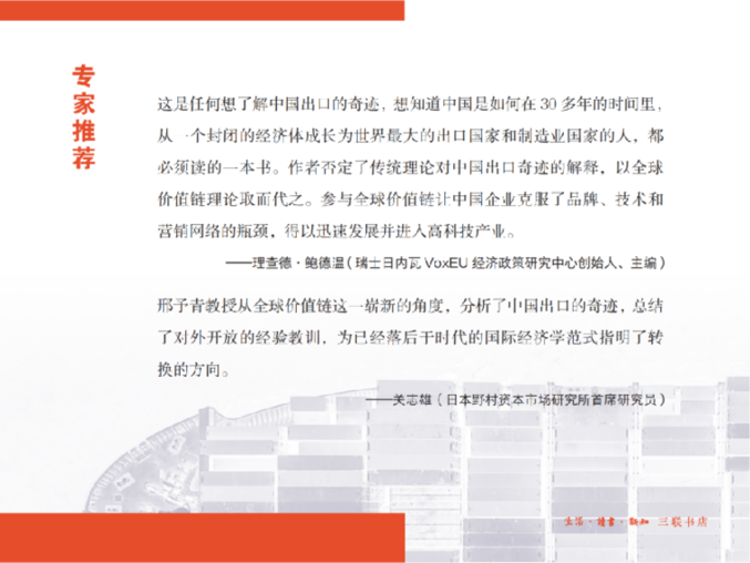 該書作者邢予青是日本國立政策研究大學(xué)院大學(xué)經(jīng)濟(jì)學(xué)教授,研究全球價(jià)值鏈?zhǔn)嗄辍2煌诶罴螆D的比較優(yōu)勢理論、赫克歇爾-奧林模型或者保羅·克魯格曼教授提出的基于規(guī)模經(jīng)濟(jì)的新貿(mào)易理論,該書第一次以全球價(jià)值鏈為框架,從中國企業(yè)在全球價(jià)值鏈中扮演的角色出發(fā),揭示了跨國公司的技術(shù)、品牌和市場營銷網(wǎng)絡(luò)對中國出口奇跡形成的決定性作用,闡述了全球價(jià)值鏈如何推動中國出口快速增長的機(jī)制。
