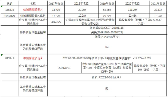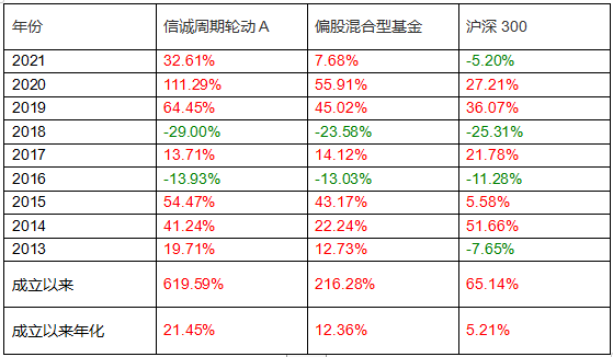 注:1、信誠周期輪動成立于2012/5/7,自2020/11/21起投資范圍增加存托憑證。成立9個完整自然年度指2013-2021。其凈值增長率/業(yè)績比較基準增長率分別為,2013:19.71%/-5.49%,2014:41.24%/42.46%,2015:54.47%/6.99%,2016:-13.93%/-8.39%,2017:13.71%/17.23%,2018:-29.00%/-19.28%,2019:64.45%/29.52%,2020:111.29%/22.46%,2021: 32.61%/-2.94%。