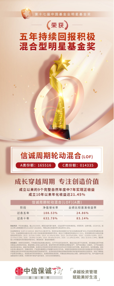 此次獲得五年持續(xù)回報積極混合型明星基金獎的信誠周期輪動混合由中信保誠基金經理張弘管理。就業(yè)績而言,截至2022年6月30日,信誠周期輪動混合(LOF)(A類)近五年收益率188.53%。而拉長時間維度來看,信誠周期輪動混合(LOF)(A類)近十年收益率實現632.78%,在成立以來的9個完整自然年度中7年實現正收益1,成立10年以來年化收益達到21.45%,其靚麗的業(yè)績使得此次獲獎可謂實至名歸。優(yōu)秀是一種習慣,信誠周期輪動混合持續(xù)為投資者創(chuàng)造回報,也得到了諸多評價機構的認可,2021年7月也在由上海證券報主辦的第十八屆中國“金基金”獎中榮獲“金基金·偏股混合型三年期”獎。