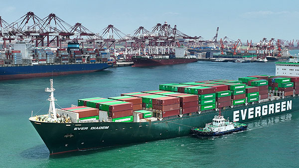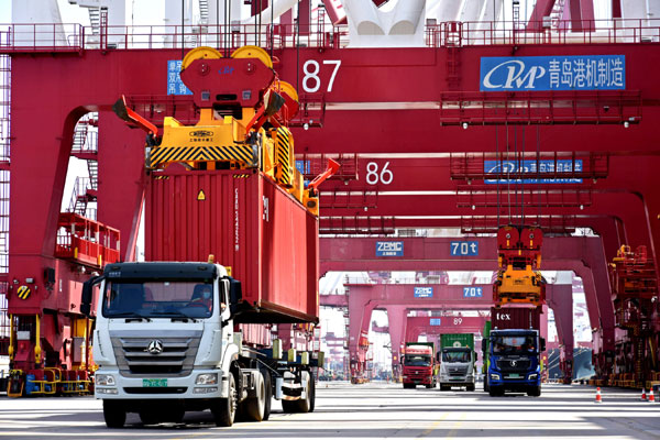 山東港口青島港前灣港區(qū),一艘集裝箱貨輪正進(jìn)港靠泊碼頭。