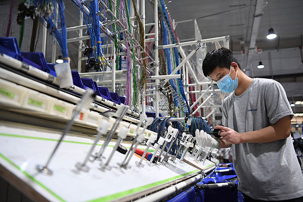 工人在位于三河市的廊坊萊尼線束系統(tǒng)有限公司生產(chǎn)車間工作。記者 朱旭東 攝