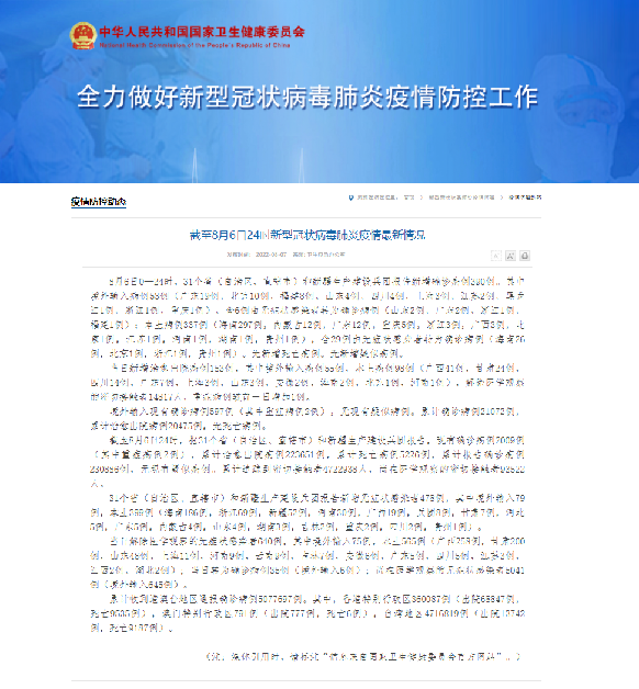 截至8月6日24時,據(jù)31個?。ㄗ灾螀^(qū)、直轄市)和新疆生產(chǎn)建設兵團報告,現(xiàn)有確診病例2009例(其中重癥病例2例),累計治愈出院病例223651例,累計死亡病例5226例,累計報告確診病例230886例,無現(xiàn)有疑似病例。累計追蹤到密切接觸者4722938人,尚在醫(yī)學觀察的密切接觸者93522人。