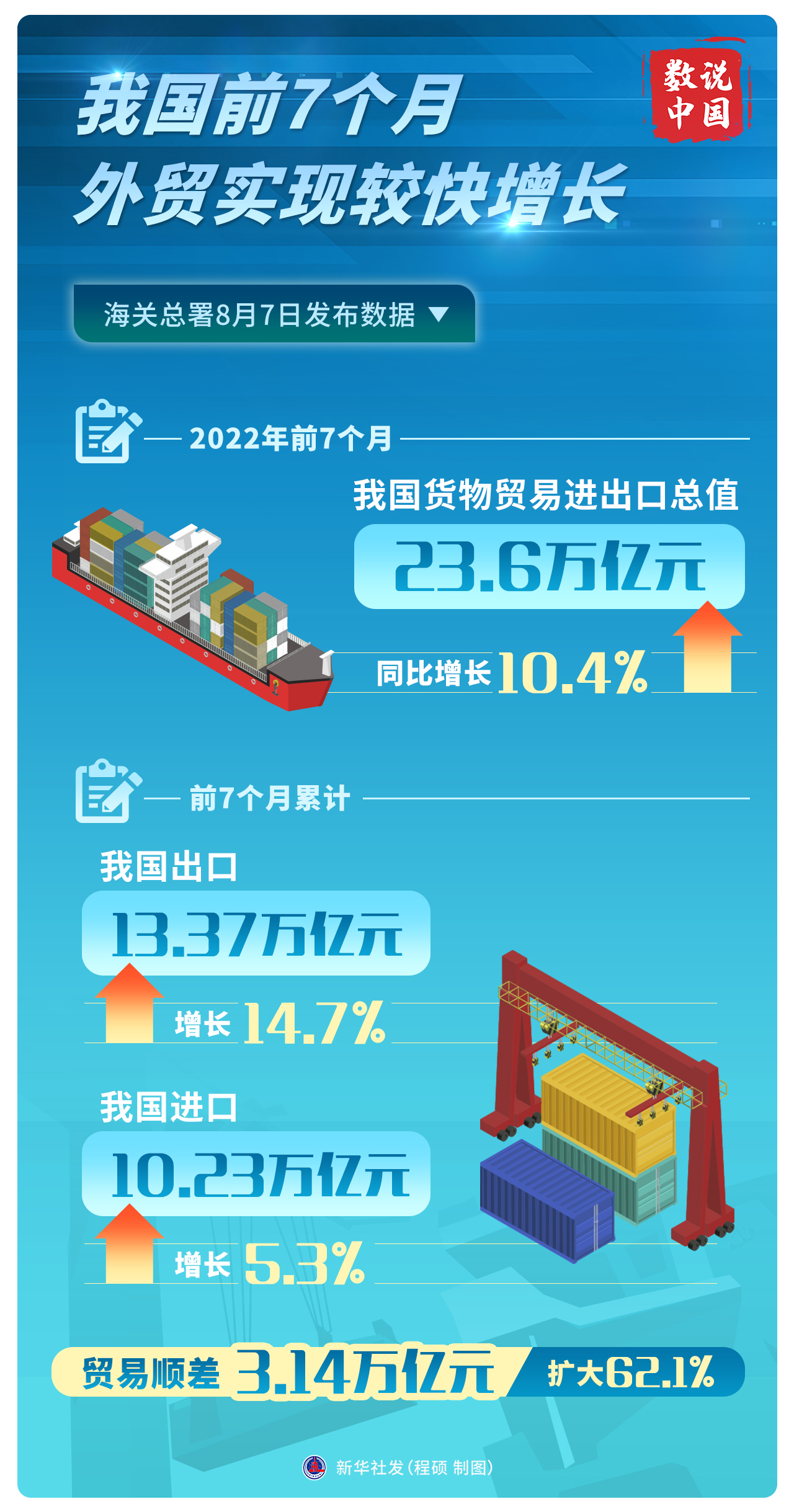 8月7日,海關(guān)總署發(fā)布數(shù)據(jù)顯示,今年前7個(gè)月,我國(guó)進(jìn)出口總值23.6萬(wàn)億元人民幣,比去年同期增長(zhǎng)10.4%。其中,7月份進(jìn)出口總值3.81萬(wàn)億元,同比增速進(jìn)一步提升為16.6%。