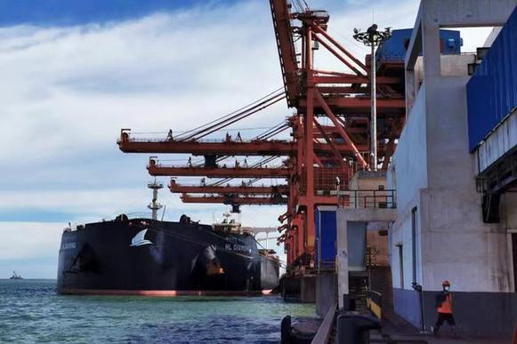 近日,承載廣西供應(yīng)鏈服務(wù)集團(tuán)進(jìn)口的5.72萬噸菲律賓鎳礦的貨輪,靠泊在山東嵐橋港并卸貨。資料照片