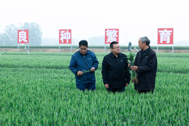 河北省小麥育種首席專(zhuān)家郭進(jìn)考(右一)和同事在察看麥苗生長(zhǎng)情況。受訪者供圖