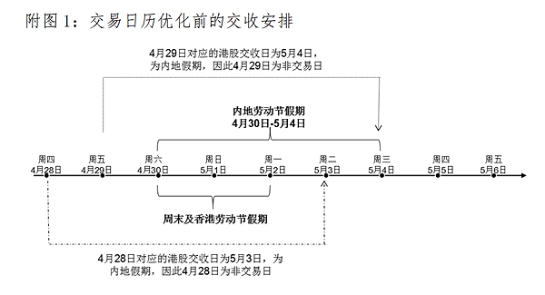 以今年的“五一”假期為例:4月28日和4月29日兩地均開市,本地投資者在當?shù)厥袌龆伎山灰?。但由于香港市場是T+2完成證券和資金的交收,上述交易日對應的港股交收日分別是5月3日和4日,為內(nèi)地假期,不能辦理結(jié)算業(yè)務。因此,這兩天不能進行港股通交易。而交易日歷優(yōu)化后,4月28日和29日內(nèi)地投資者也可以通過港股通買賣港股標的的證券。