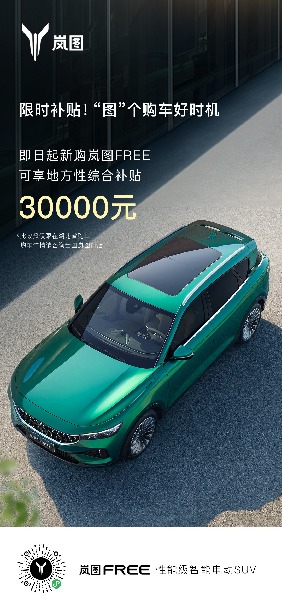 限時(shí)補(bǔ)貼來襲。2022年8月1日起,在湖北省開票下定嵐圖FREE,可享地方政府綜合性現(xiàn)金補(bǔ)貼30000元。額度有限,先到先得。(推廣)