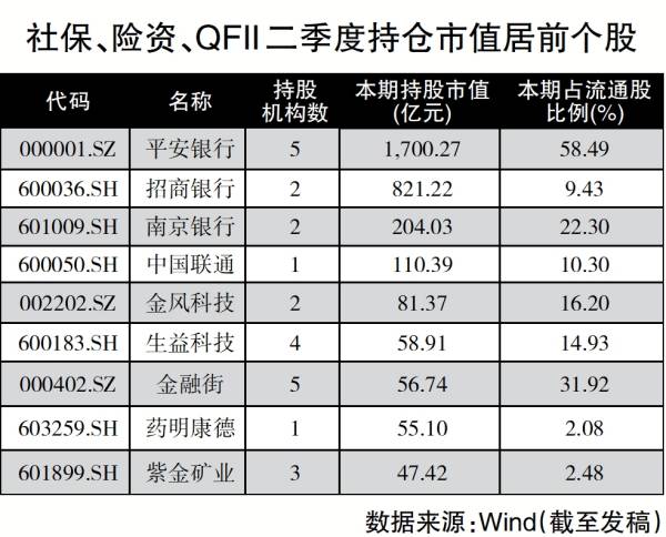 隨著市場(chǎng)回暖,長(zhǎng)線資金在二季度整體呈加倉(cāng)態(tài)勢(shì)。據(jù)Wind統(tǒng)計(jì),從已披露數(shù)據(jù)看,截至二季度末,社?;?、保險(xiǎn)公司和QFII三大機(jī)構(gòu)共現(xiàn)身430只個(gè)股的前十大流通股東名單中,合計(jì)持股量271.78億股,與今年一季度(下稱(chēng)“上期”)相比,環(huán)比增幅達(dá)3.91%;期末持股市值合計(jì)為4409.07億元,環(huán)比增加7608.80萬(wàn)元。