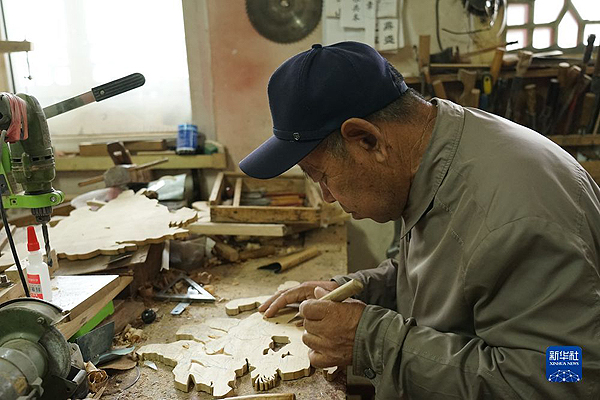 8月26日,楊增貴在木料上雕刻花紋。新華社記者解統(tǒng)強(qiáng) 攝