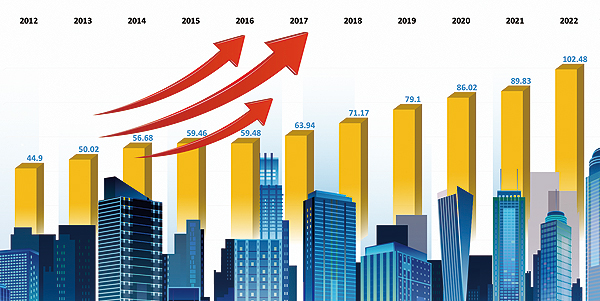 2012-2022年中國企業(yè)500強(qiáng)營業(yè)收入總額(萬億元)變化趨勢(shì)