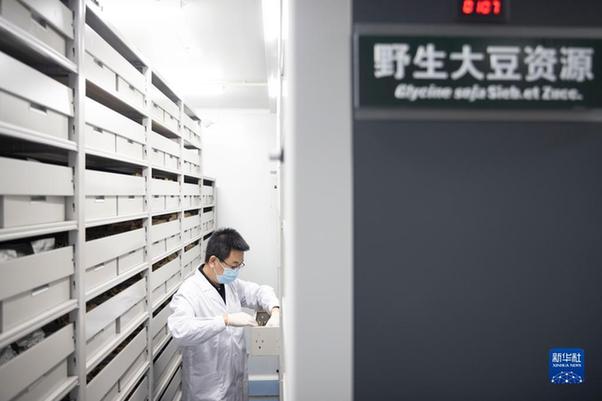工作人員在黑龍江寒地作物種質(zhì)資源庫(kù)內(nèi)查看野生大豆種質(zhì)情況(2022年5月19日攝)。新華社記者 張濤 攝
