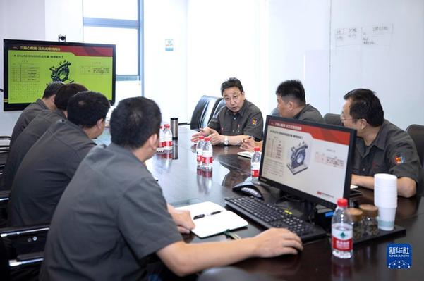 在位于寧夏吳忠市的吳忠儀表有限責(zé)任公司會(huì)議室內(nèi),馬玉山(中)與技術(shù)人員開(kāi)會(huì)(9月12日攝)。 新華社記者 楊植森 攝