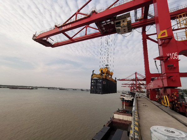 湖南城陵磯國際集裝箱港的集裝箱裝卸現(xiàn)場。記者 周楠 攝