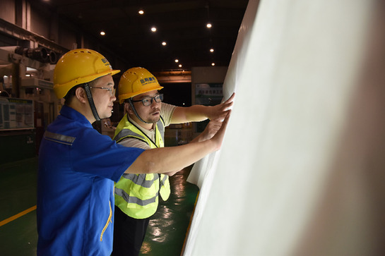 岳陽林紙股份有限公司出口拓展部部長王子剛(右一)在車間查看產(chǎn)品。記者 白田田 攝